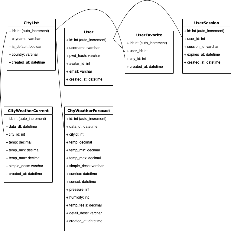 - User: Stores registered user information. Fields include user ID, password hash, avatar ID, email, favorite cities, user sessions, etc.