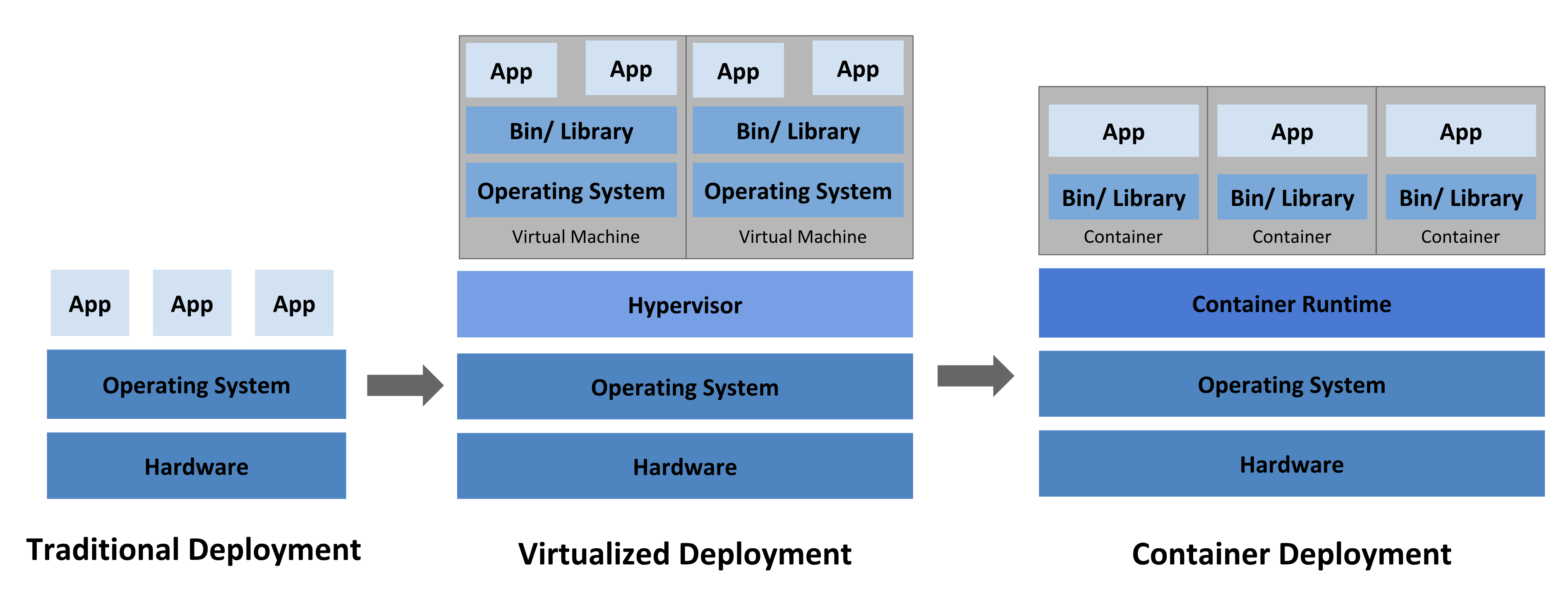 Traditional virtualization allows multiple operating systems to run on a single physical server by using a hypervisor (such as VMware ESXi or Microsoft Hyper-V) to allocate resources. This significantly improved hardware utilization, lowered costs, and provided flexibility in managing applications.